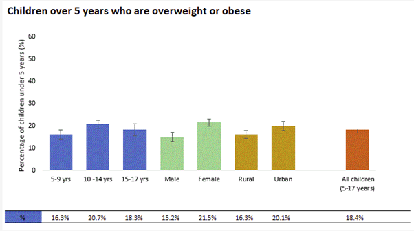 Overweight and obesity rates are significantly higher among older children. Data from the most recent wave of NIDS (2017) show 16% of children aged 5 – 9 and 22% of those aged 10 – 14 are classified as overweight or obese. Overall, 18% of children aged 15 – 17 years were found to be overweight or obese. The rate was significantly higher for girls (22%) than boys (15%), and for children living in urban areas (20%) compared to rural areas (16%).
