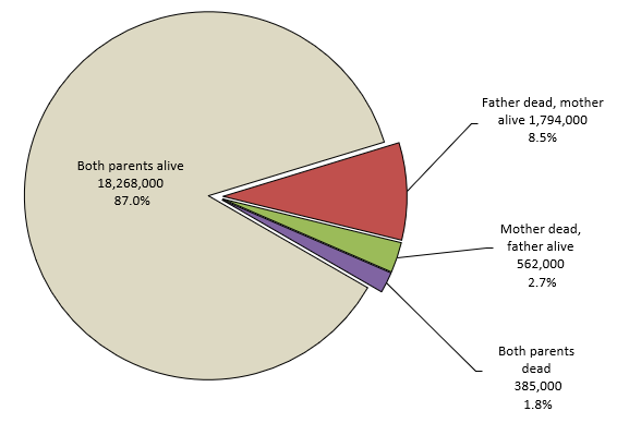 Orphan status is not necessarily an indicator of the quality of care that children receive. It is important to disaggregate the total orphan figures because the death of one parent may have different implications for children than the death of both parents. In particular, it seems that children who are maternally orphaned are at risk of poorer outcomes than paternal orphans – for example, in relation to education.